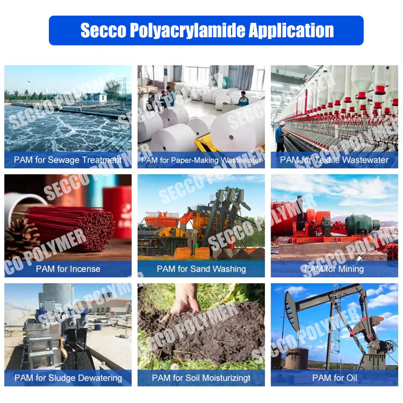 Polyakrylamidová emulzia sa široko používa v rôznych domácich odpadových vodách, chemických odpadových vodách, odpadových vodách ropných polí, odvodňovaní kalov, papieri a iných oblastiach. Polyakrylamidová emulzia vody v oleji sa tiež široko používa v čistení mestských odpadových vôd, pivovar, továreň na škrob, potravinárske spracovateľské závody a iné čistenie odpadových vôd. Obzvlášť sa uplatňuje likvidácia flokulácie organických suspendovaných tuhých látok v kyslých alebo kyslých odpadových vodách. V papierárskom priemysle by sa mohol použiť ako filter na udržanie, čistenie odpadových vôd pri výrobe papiera. Ropný priemysel môže byť použitý ako vŕtanie emulzie povlakové činidlo alebo odmastania činidlo.